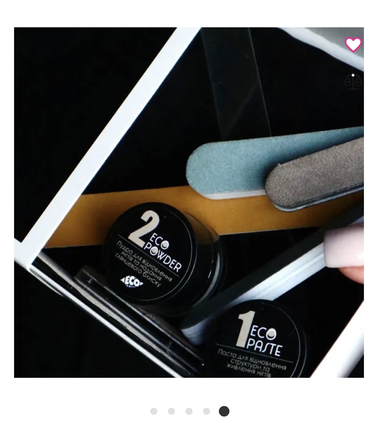 - Комплектация: Eco Paste 5 мл, Eco Powder 5 мл, прямая основа для пилочки, 2 сменных файла Grit 1, 2 бафа для глянцевания, инструкция на обороте коробки.
